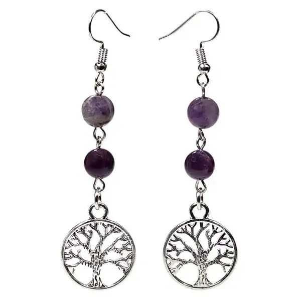 Øreringe med fluorit, ametyst og livets træ: en harmoni af spiritualitet