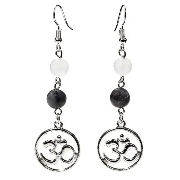Øreringe med labradorit, hvid agat og Ohm-symbolet repræsenterer en smuk forening af mystik, beroligende energi og spiritualitet.