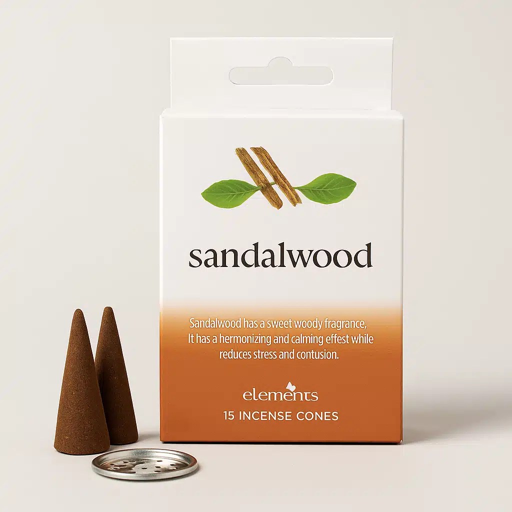 Elements Sandalwood Cones er røgelseskegler med den klassiske, varme og træagtige duft af sandeltræ, som gennem århundreder har været anvendt i både spirituelle ritualer, meditation og til afslapni